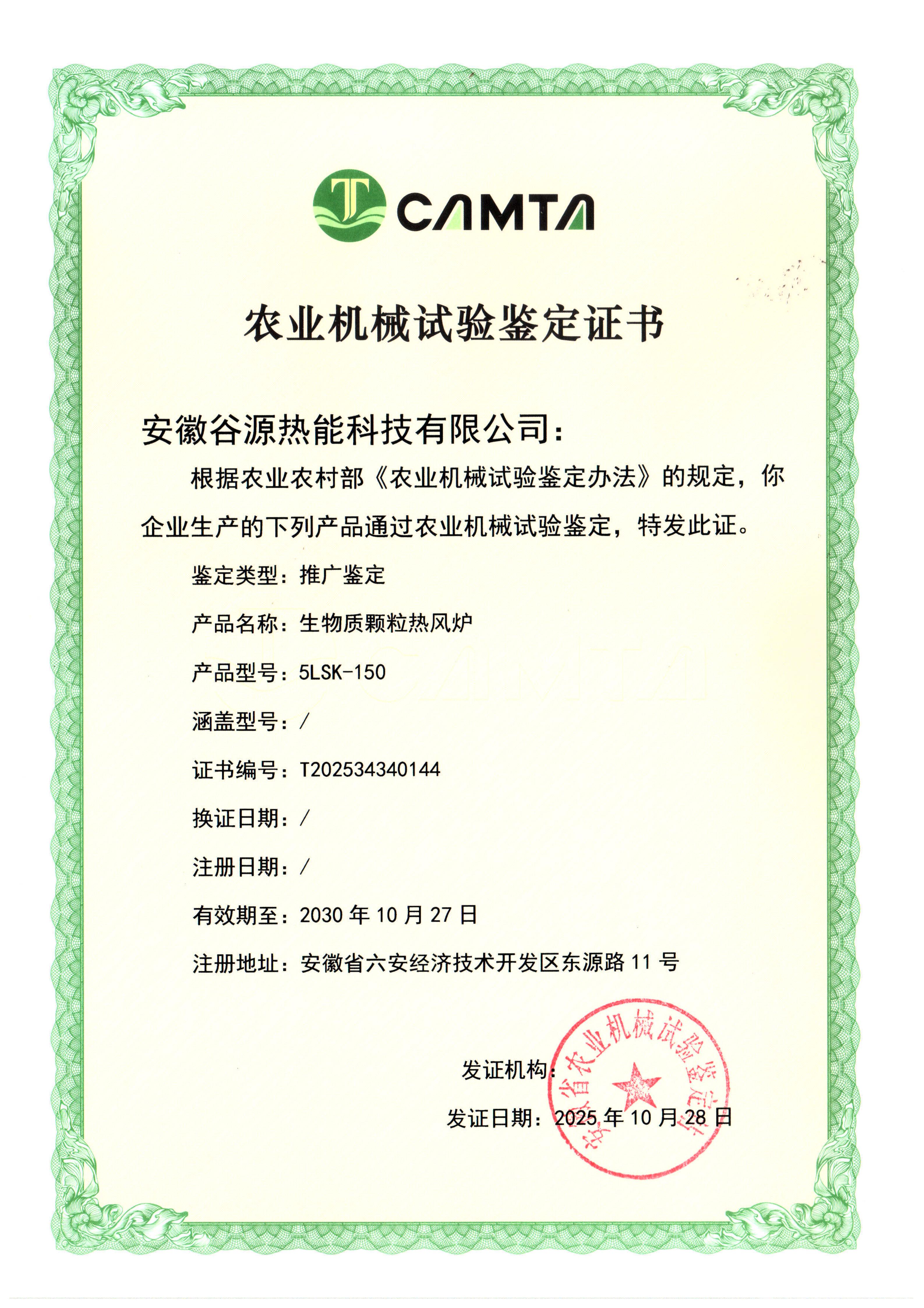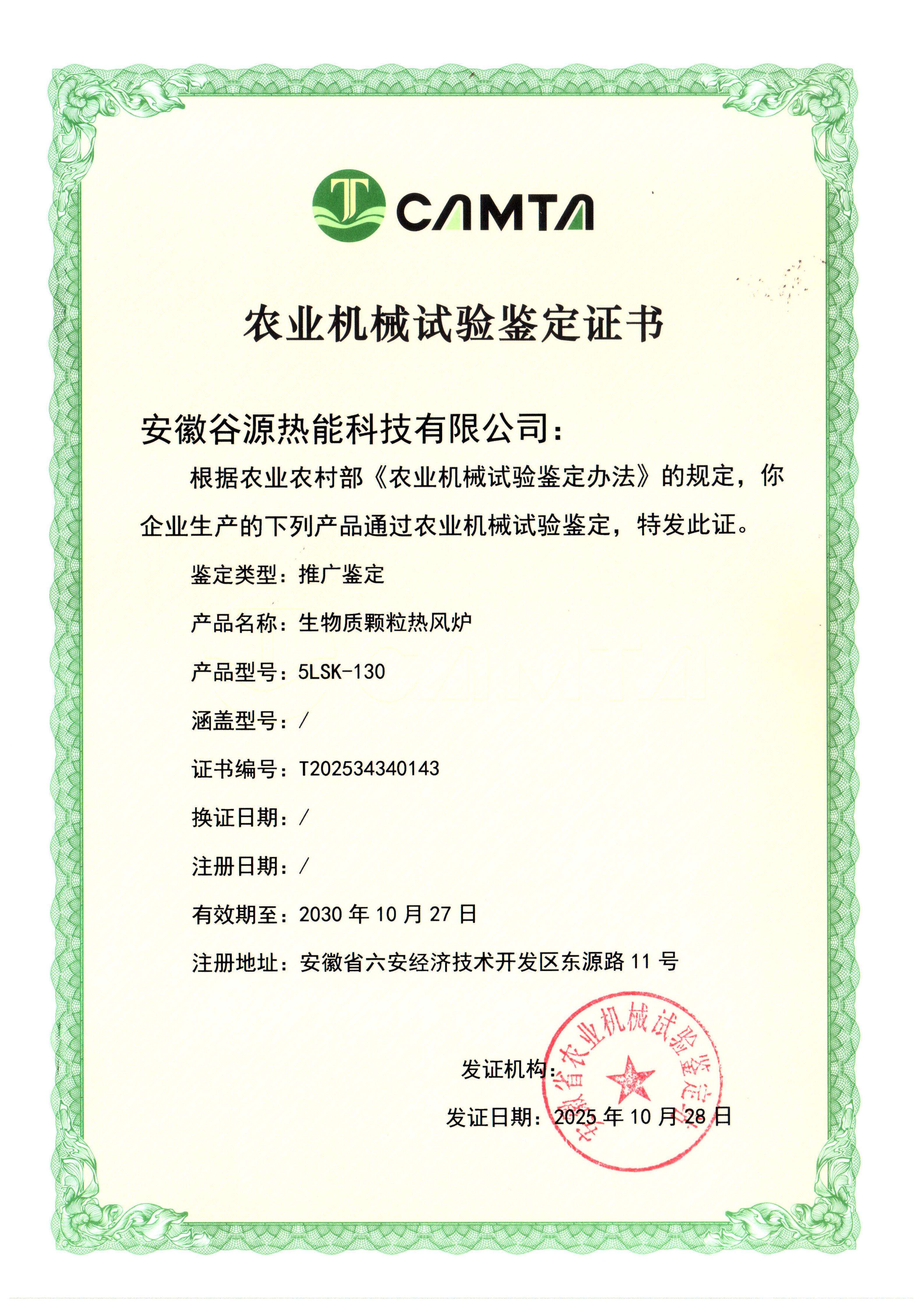 根据农业农村部《农业机械试验鉴定办法》的规定,安徽谷源热能科技有限公司生产的:5LSK-130;5LSK-150,两种生物质成型燃料热风炉产品,于2025年10月28日通过农业机械试验鉴定,正式荣获农业机械试验鉴定证书。